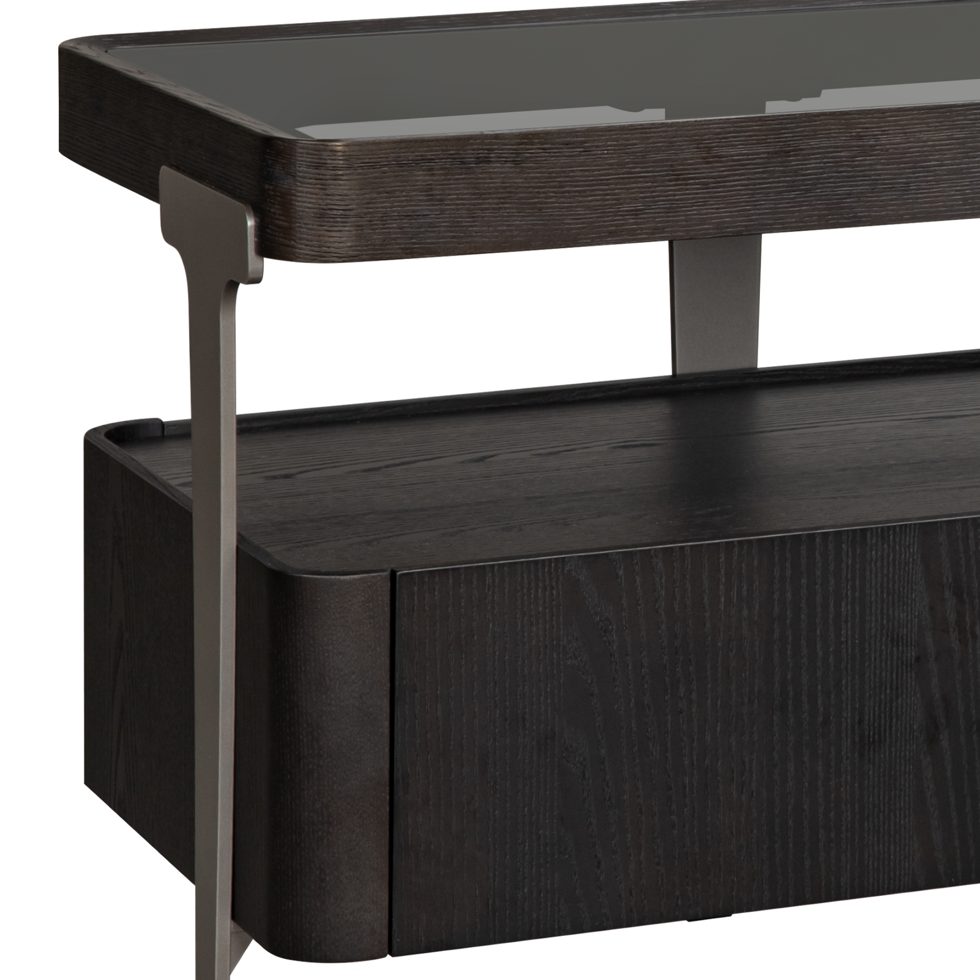 Materials: Tempered Glass, White Ash wood, MDF, Veneer, Powder Coated Metal